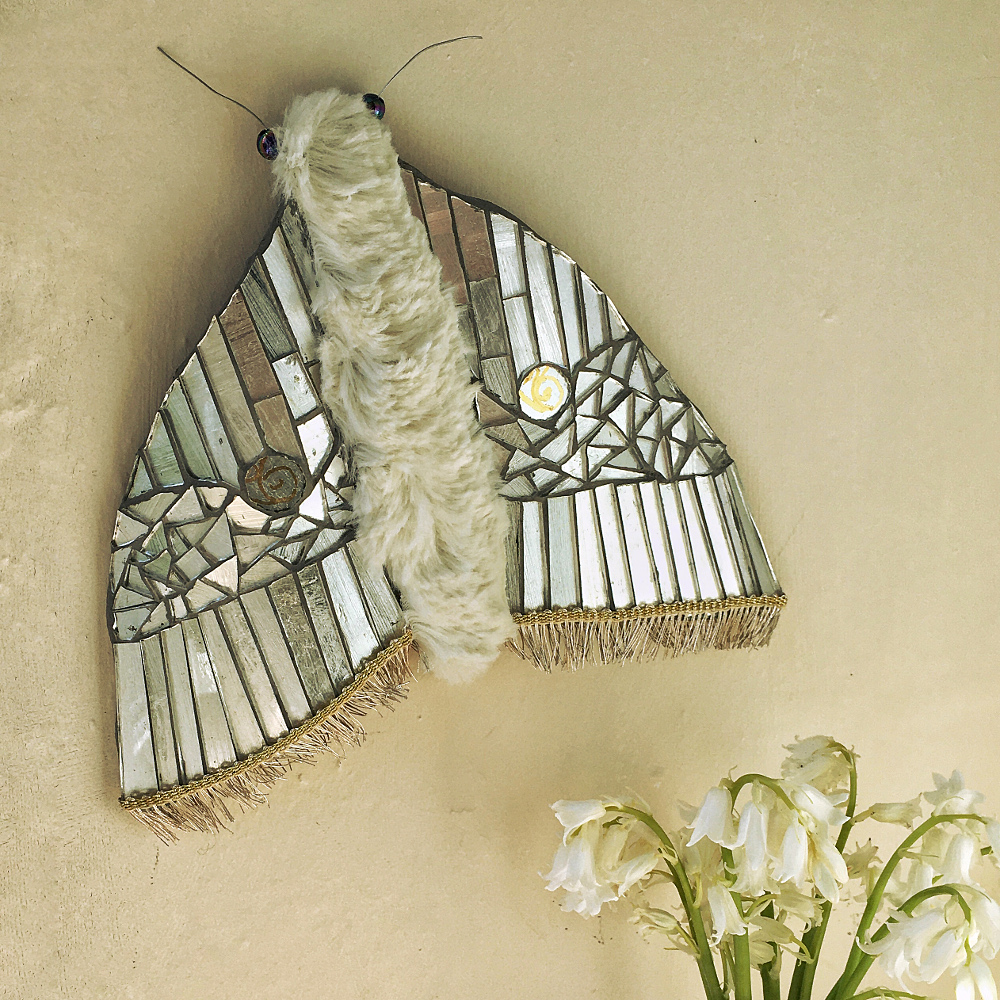 These whimsical silver moths for the wall will add a little fun to your home. They are hand built using wire and cement, bodies decorated in acrylic fur and wings decorated in my own exclusive hand gilded aluminium and silver leaf glass and finished with upholstery trim.